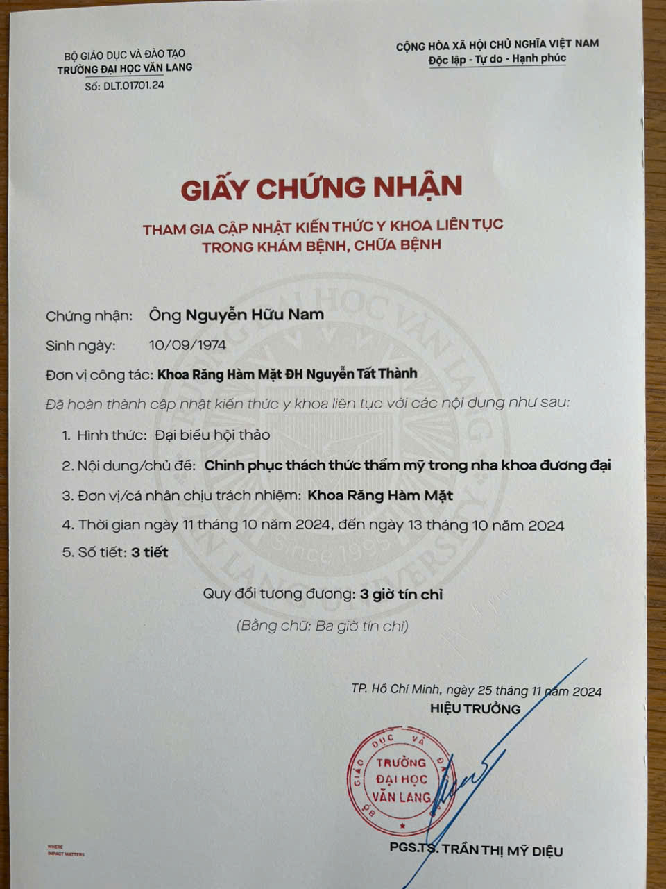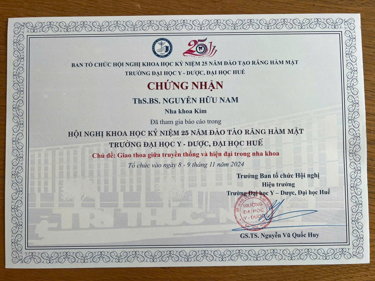 - Chứng nhận tham gia Hội nghị khoa học kỷ niệm 25 năm đào tạo Răng Hàm Mặt năm 2024