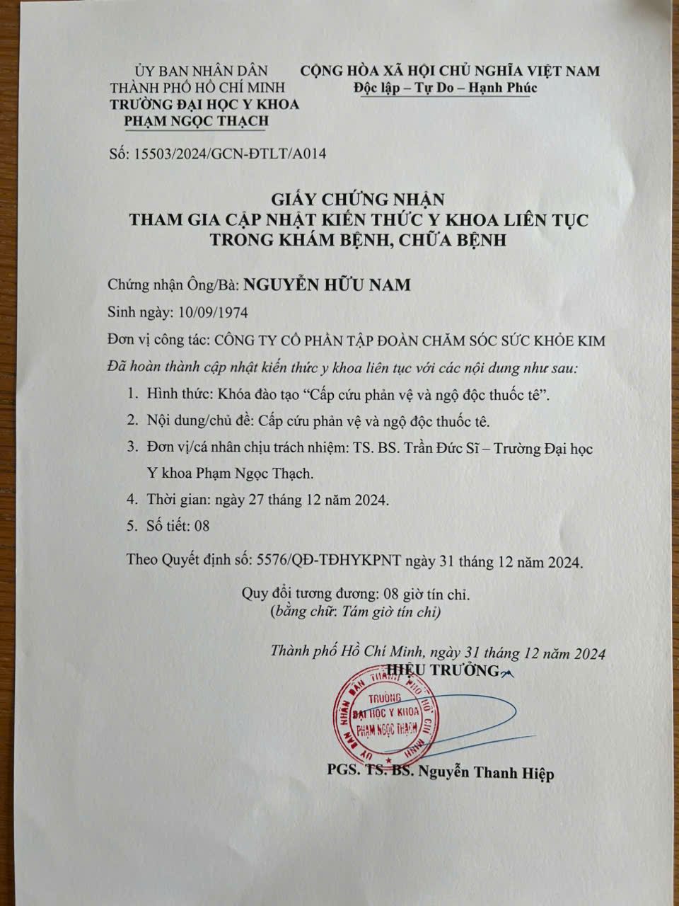 Một số chứng nhận thành tựu khác của ThS. BS Nguyễn Hữu Nam: