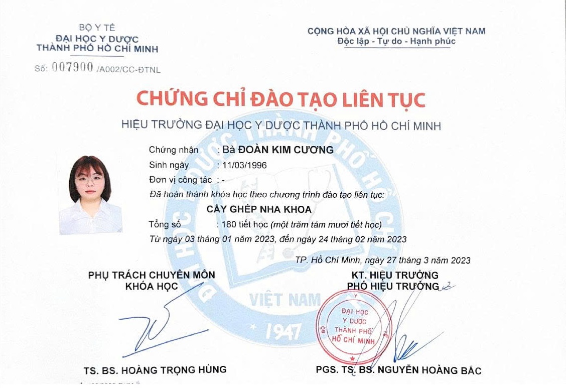 Chứng chỉ Implant bác sĩ Nha khoa Kim Đoàn Kim Cương