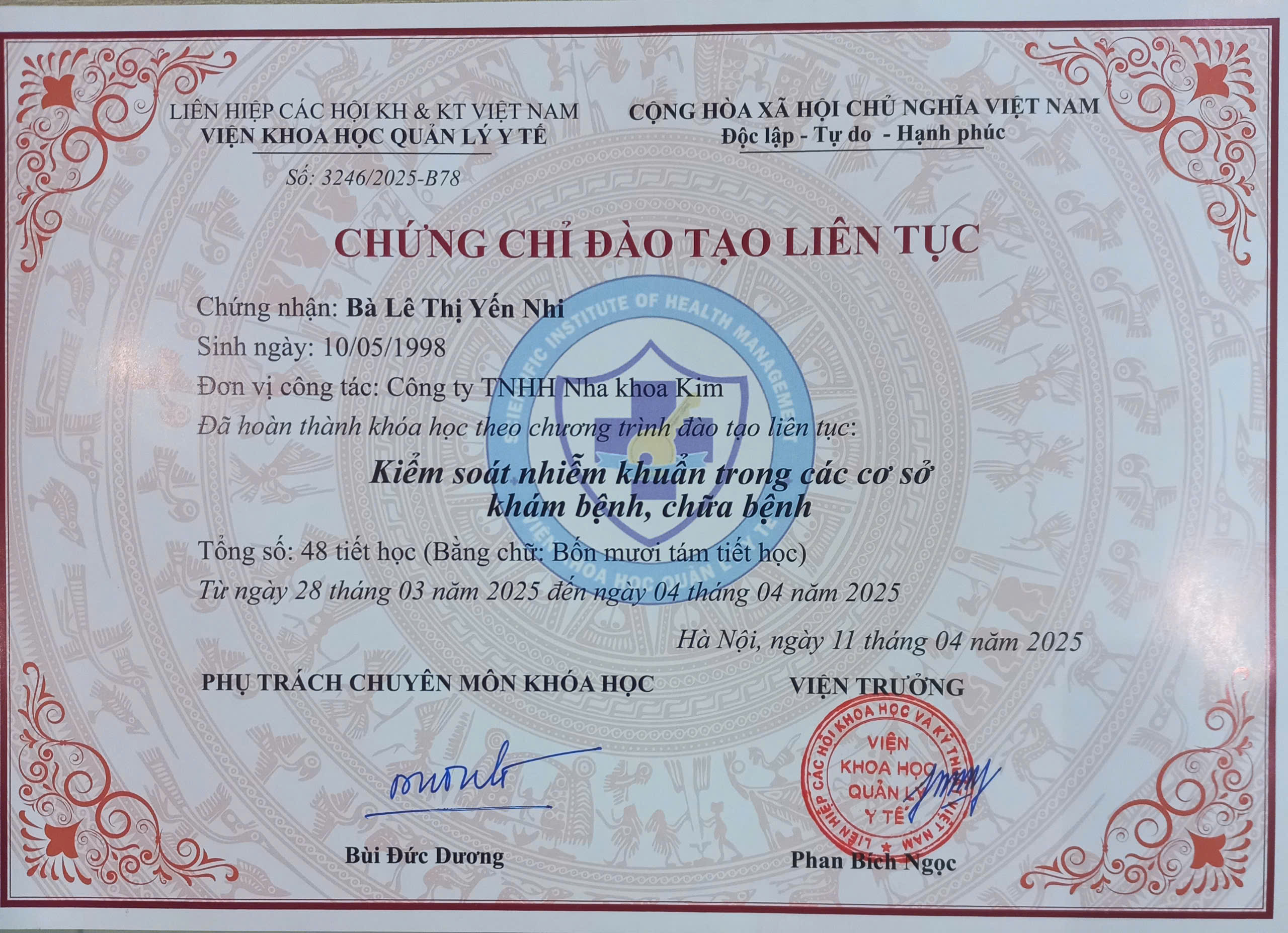 Bác sĩ Lê Thị Yến Nhi là một chuyên gia trong lĩnh vực Răng Hàm Mặt, với nền tảng học vấn vững chắc và kinh nghiệm thực tiễn phong phú. Bác sĩ tốt nghiệp từ Khoa Răng Hàm Mặt, Đại học Y Dược TP.HCM, một trong những trường đại học uy tín hàng đầu trong lĩnh vực y tế tại Việt Nam. Sau khi hoàn thành chương trình học, bác sĩ Lê Thị Yến Nhi đã tích lũy thêm các chứng chỉ và khóa đào tạo chuyên sâu để nâng cao trình độ và đáp ứng nhu cầu điều trị ngày càng cao của bệnh nhân.