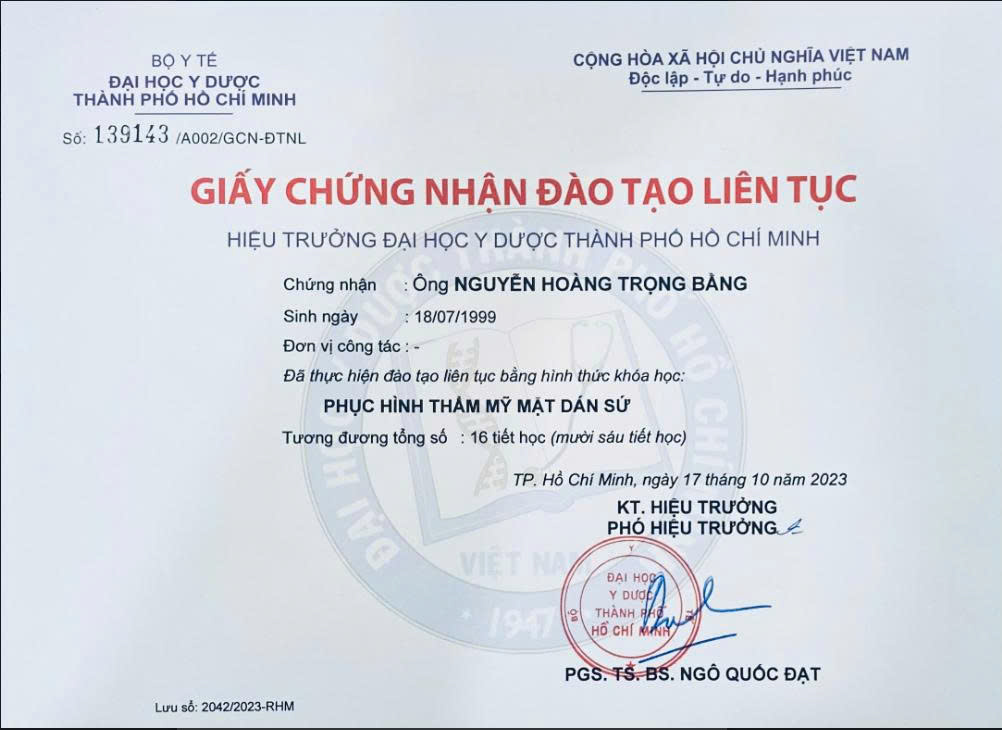 Với nền tảng đào tạo bài bản và định hướng phát triển chuyên môn rõ ràng, bác sĩ Nguyễn Hoàng Trọng Bằng chú trọng đến tính chính xác – an toàn – hiệu quả lâu dài trong từng ca điều trị, hướng đến mang lại kết quả điều trị phù hợp và ổn định cho khách hàng.