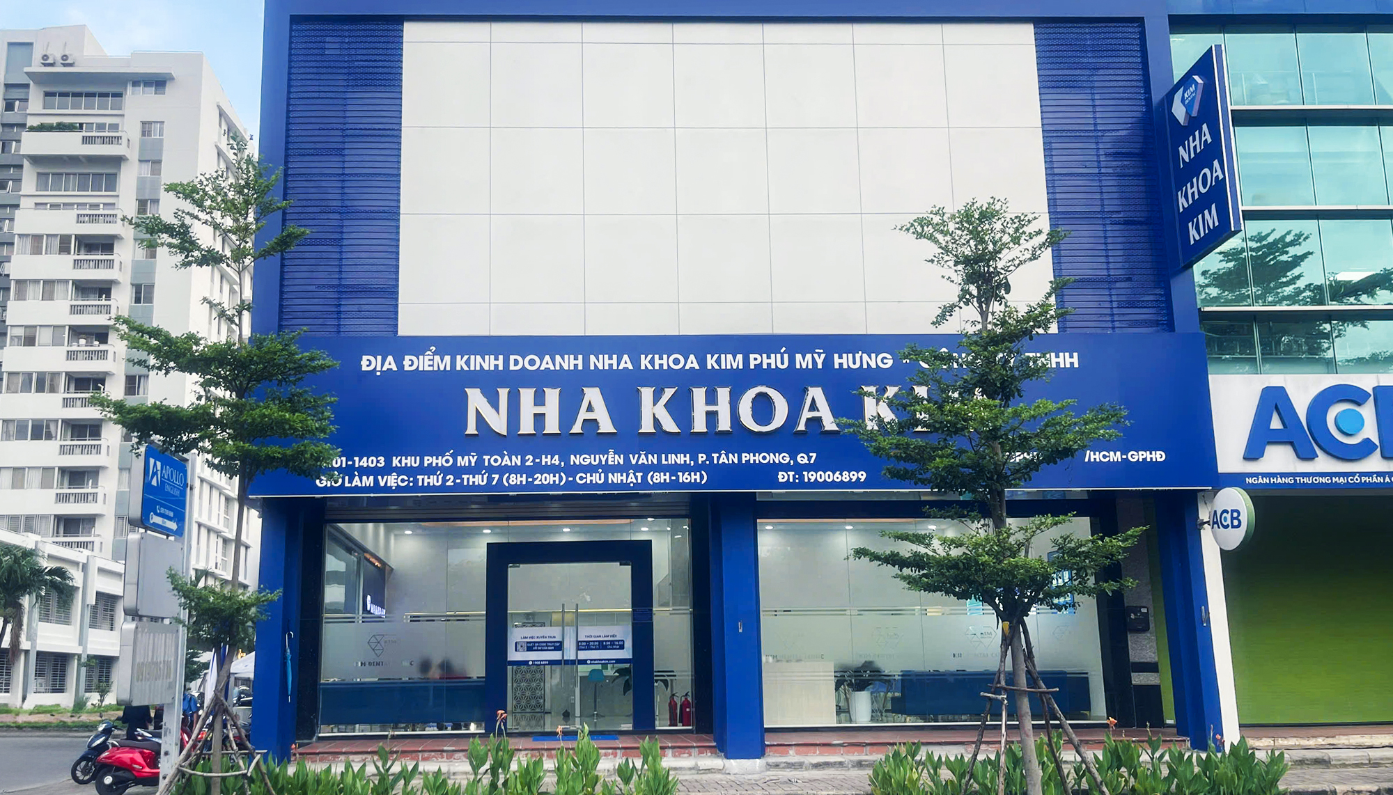 Sau 2 phòng khám tại Nguyễn Thị Thập, Q.7, Nha Khoa Kim tiếp theo tại Q.7 tọa lạc tại địa chỉ 1401 – 1403 Khu phố Mỹ Toàn 2-H4 Nguyễn Văn Linh, P. Tân Phong, Q.7. Đây được xem là một trong những khu vực nhộn nhịp của Q.7 khi gần đại học RMIT Nam Sài Gòn, hồ Bán Nguyệt, gần các khu trung tâm thương mại lớn SC Vivo City, Cresent Mall…