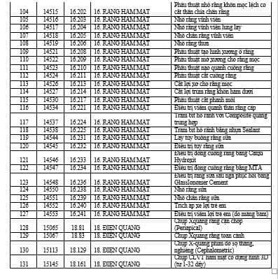 | 126 | Chụp Xquang răng cận chóp ( Peripical) | Gói dịch vụ | Phim | 1 | 50,000 | 34,000 | 9,000 | 19,000 | 6,000 | 1,000 | 4,000 | 500 | 500 | 8,500 | 5,000 | 47,500 | 2,500 | 50,000 | – | 50,000 |