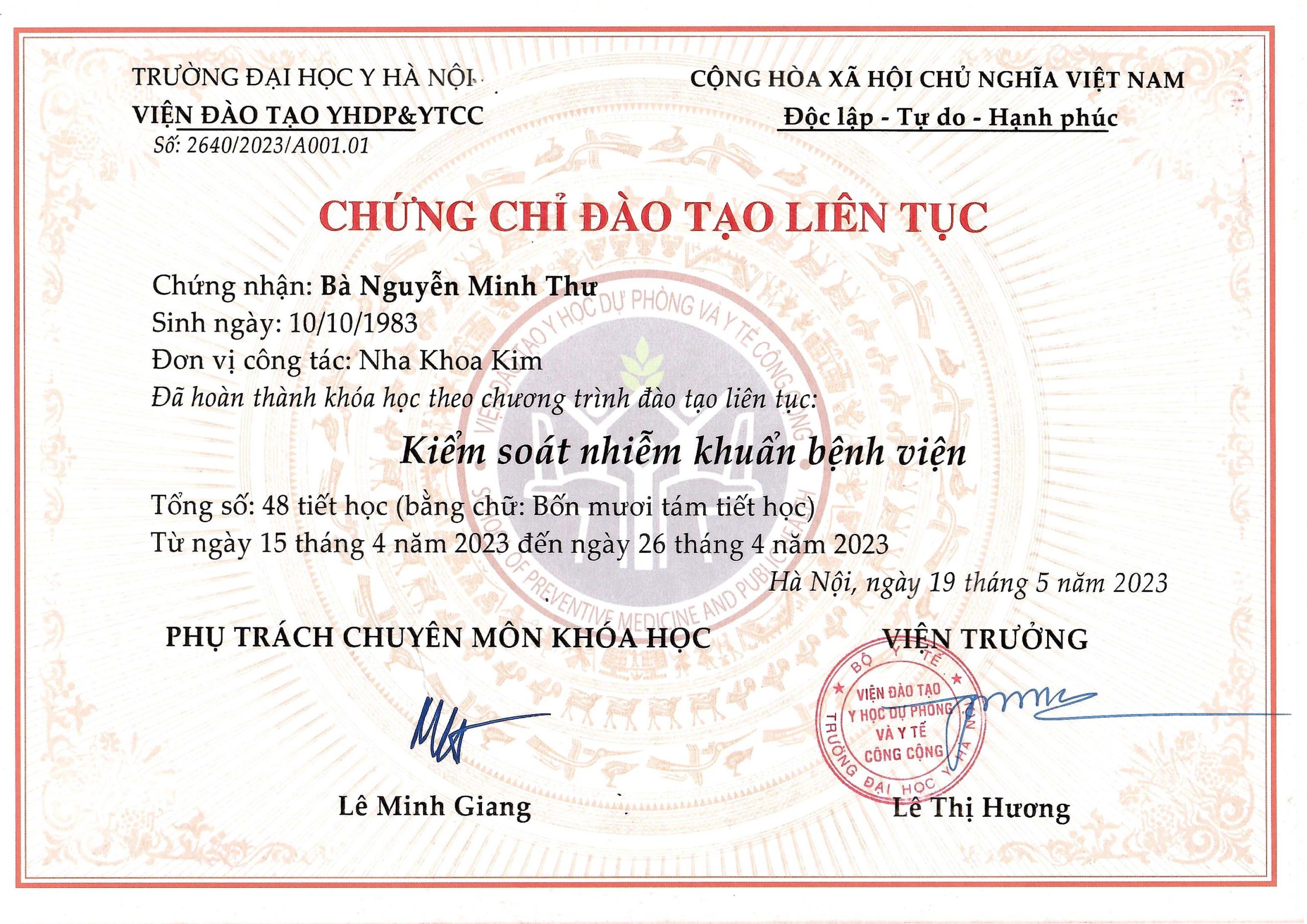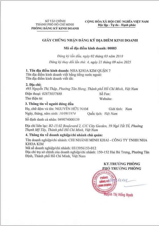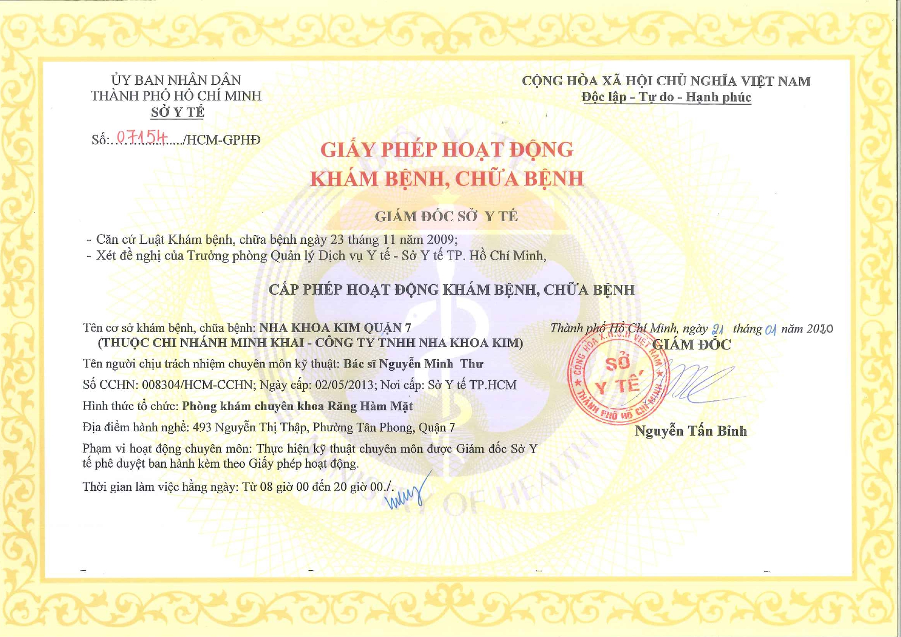 Giấy phép hoạt động khám chữa bệnh Nha Khoa Kim Quận 7 (Thuộc chi nhánh Minh Khai – Công ty TNHH Nha Khoa Kim)