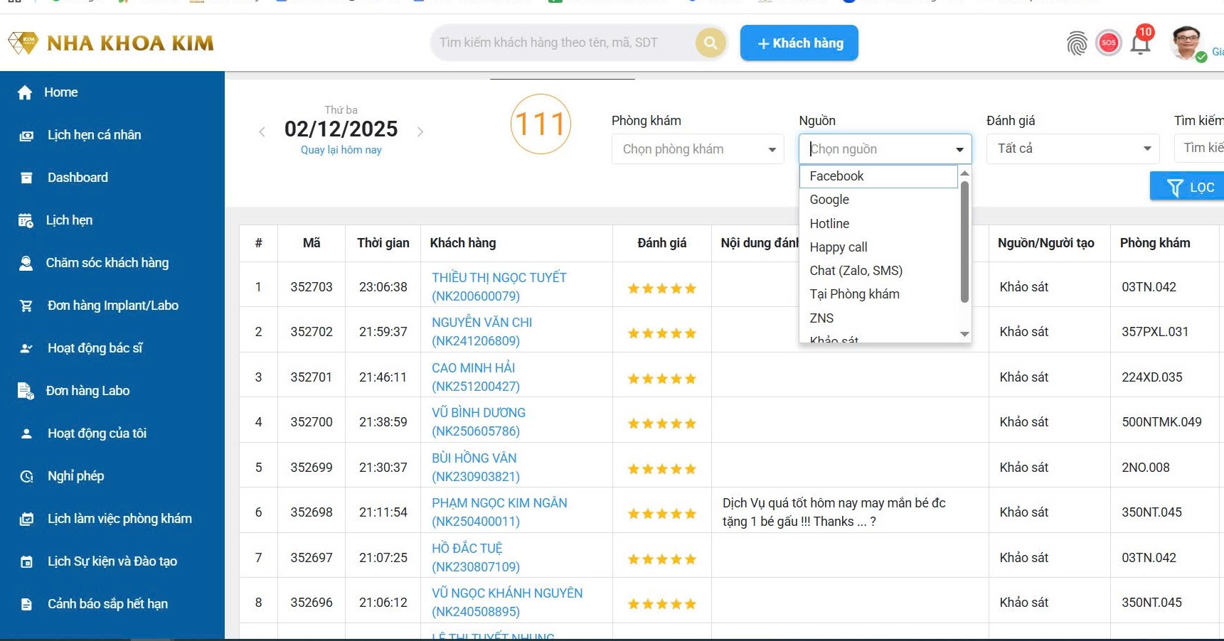 Nguồn đánh giá (Google, Facebook, Hotline, khảo sát tại phòng khám…)