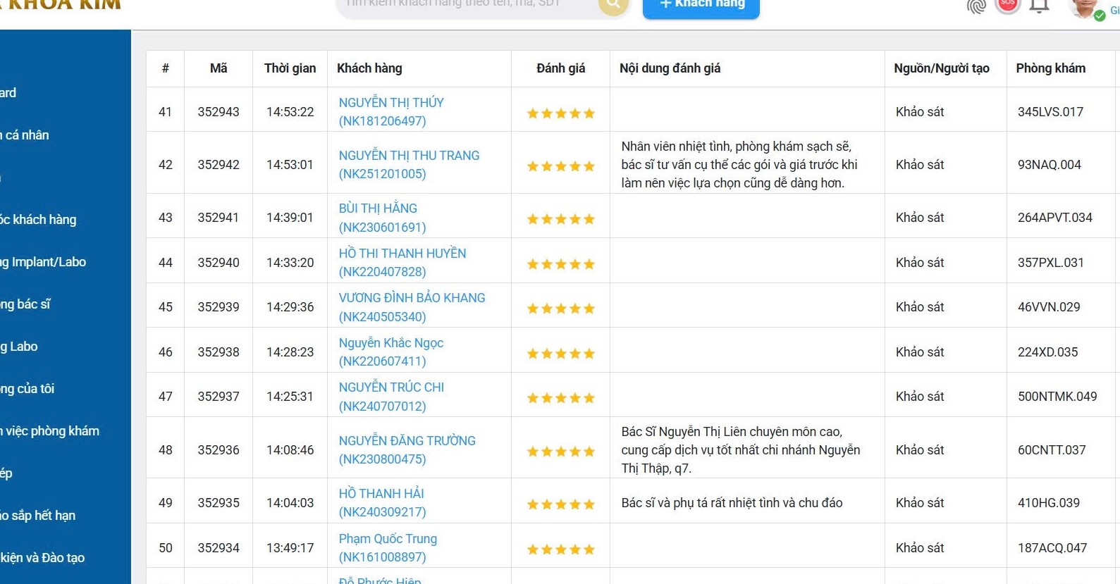 Minh chứng review Nha khoa Kim real-time: bảng Customer Rating trên ERP hiển thị số sao, nội dung phản hồi và nguồn khảo sát của khách hàng tại từng phòng khám.